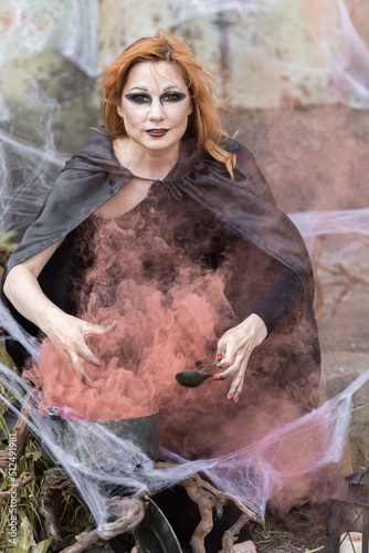 Attractive beautiful woman in a Halloween costume black cloak and scary make-up. Young girl in a look of a witch dressed up for a party making fairy potion holding black lantern