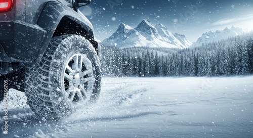 Automobile adventure through snowy mountains, conquering the winter landscape with tire power