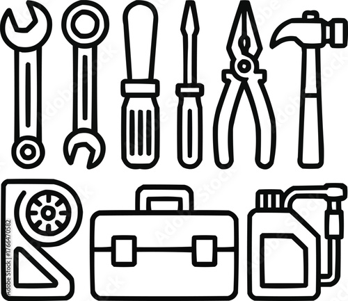 Automotive Tools Outline Icons Set Wrenches, Screwdrivers, and Garage Equipment Line Art