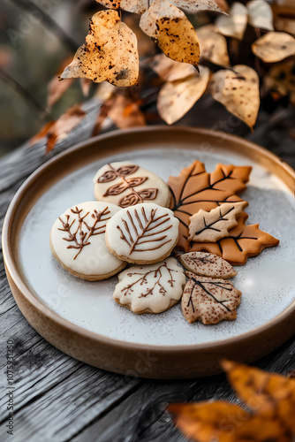 Autumn Leaf-Shaped Cookies on Rustic Plate with Fall Decor