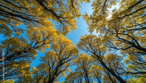 Autumn leaves canopy forest nature photography bright sky upward view tranquility