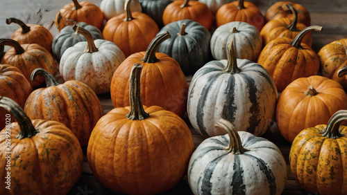 Autumn pumpkin background. A rich harvest of small pumpkins on a wooden background. The concept of a Halloween or Thanksgiving holiday.