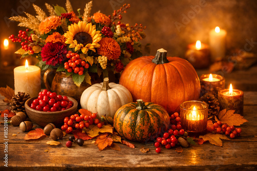 Autumn Still Life with Pumpkins, Flowers, Candles, Thanksgiving