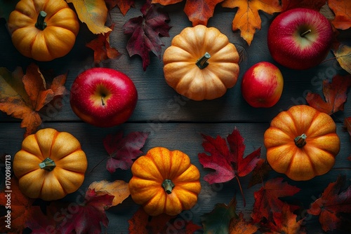 Autumnal display of pumpkins, apples, and colorful leaves on a dark wooden surface, evoking a warm and inviting fall atmosphere.