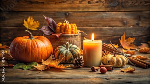 Autumnal Still Life with Pumpkins, Candle, and Fall Leaves on Rustic Wooden Surface