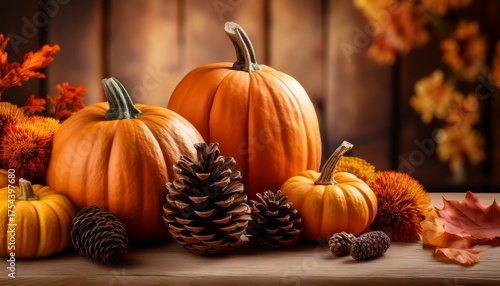 Autumnal Still Life With Pumpkins Pine Cones And Mums In Warm Tones Celebrating The Harvest Season And Thanksgiving Holiday