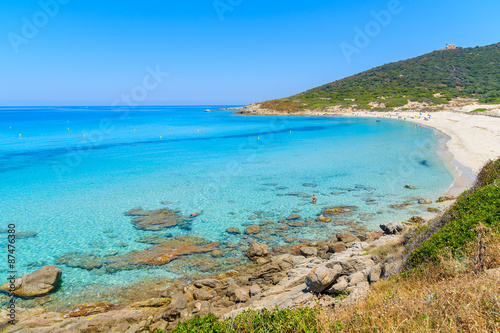 Azure sea water on Bodri beach near L'lle Rousse, Corsica island, France