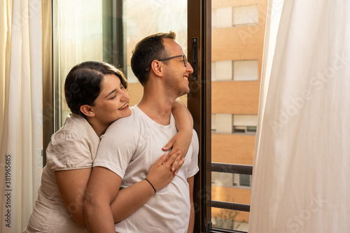 hug, window, couple, love, romantic, hope, smile, laugh, natural, laughing, young, woman, man, lady, room, house, weekend, fun, enjoy, live, together, partner, married, just married, caucasian, wood, warm, cosy, joy, relaxed, interest, sharing, time, leisure, share, look, beautiful, attractive, spanish, sitting, casual attire, lay, laying, lovely, boyfriend, girlfriend