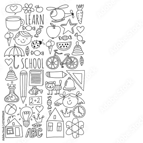 Back to School vector doodle set. Supplies for sport, art, reading, science, geography, biology, physics, mathematics, astronomy, chemistry.