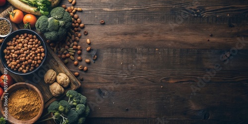 Background for a Banner on the Theme - Healthy Eating. A large bowl filled with diverse plant-based ingredients takes center stage, surrounded by additional produce.