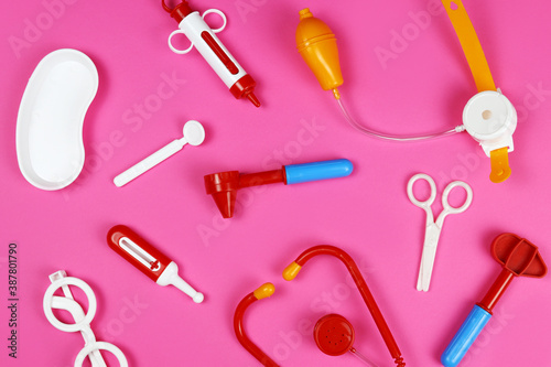 Background of toy medical doctor tools on pink background
