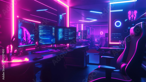 background with a futuristic gaming room, featuring neon lights, sleek gaming equipment, and a high-tech, immersive setting