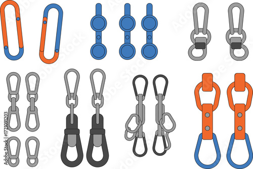 Bag hook hardware and carabiner clip vector illustration set, metal clasp connector, keyring fitting, outdoor accessory design, multipurpose gear connector