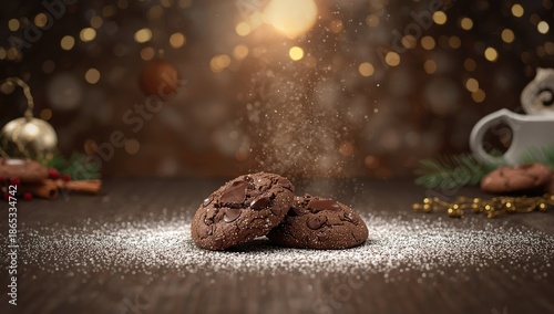 Baked chocolate cookies displayed in bakery, focusing on production quality and cleanliness