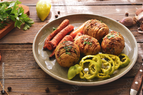 Baked potatoes with carrots. Gray plate. Wooden background. Delicious and healthy lunch. Hasselback potatoes.
