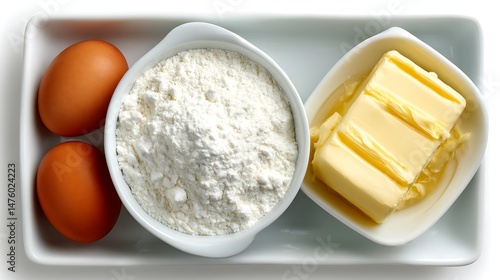 egg, flour, butter, baking, ingredient, cooking, receipe, food, pastry, dessert, cake, bread, culinary, kitchen, cooking ingredient, topview, white background, food photography, culinary arts, homemade, breakfast, brunch, sweet, delicious, health food, bowl, dairy, food preparation, nourishment, finance, advertising
