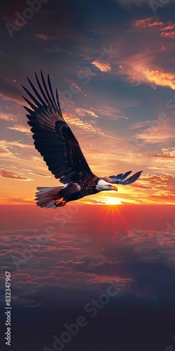 Bald eagle gracefully flies over clouds at sunset