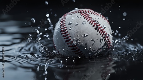 Baseball ball in splashing water on background,baseball ball splashing, and Flying,Closeup Baseball player hitting ball with bat,home run,baseball field with grandstand,sport day,space for text.