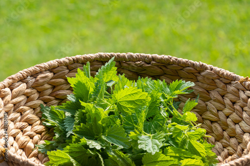 Basket with fresh harvested nettle plant leaves in the meadow. Healthy food, superfood, herb for health and beauty, skin care cosmetic, hair treatment
