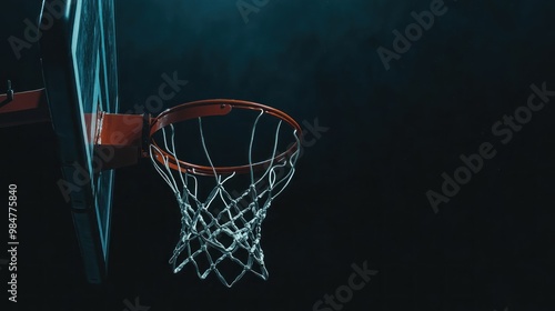 basketball, hoop, net, court, game, sport, indoor, play, competition, athlete, fitness, training, exercise, ball, score, dunk, shot, rim, backboard, orange, white, metal, dark, room, night, shadow, blue, black, smoke, texture, contrast, light, minimalism, simple, abstract, closeup, detail, focused, sharp, still, life, photo, lighting