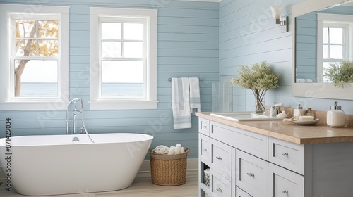 bathroom, home, interior, illustration, coastal, light blue, elegance, fixture, marble, countertop, freestanding, bathtub, roomy, shower, storage, luxurious, inviting, relaxation, wall, ceiling, charming, design, decor, vibe, space, blue, serene, stylish