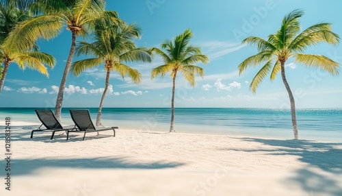 Beach scene with two lounge chairs and palm trees. The chairs are empty and the palm trees are tall. The beach is calm and peaceful, with the ocean in the background