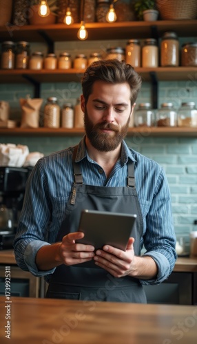 barista, tablet, cosy, bearded, hot drink, modern, technology, service, warm, inviting, ingredient, dedication, atmosphere, hospitality, workspace, professionalism, casual attire, interaction, sharpened, craftsmanship, lifestyle, contemporary, brewing, customer service, engagement, artisanal, friendly, ambience, relaxation, cafes, attentive, charming, trendy, urban, service industry