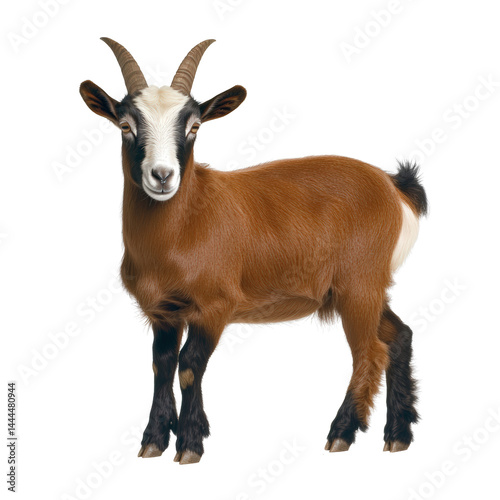 Beautiful brown goat with curved horns, short beard, white markings on face and legs, standing on white background showcasing detailed fur, eyes, and posture