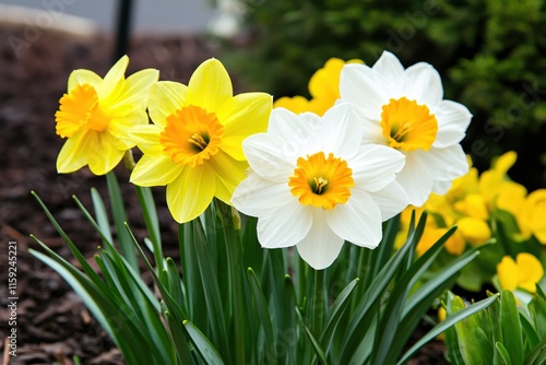 daffodil, flower, bloom, yellow, white, garden, spring, nature, vibrant, flower petals, flora, seasonal, growth, freshness, beauty, landscape, sunlight, calmness, design, botany, horticulture, gardening, bright, colours, floral, blooming, decoration, park, aesthetic, green, peaceful, colourful, blossom, artistic, macro, closeup, natural, high-coloured, cheerful, tranquil, leaf