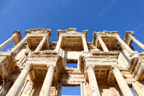 beautiful facade with columns of Library of Celsus in archaeological site Ephesus in Turkey under clear autumn blue sky