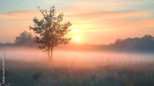 Beautiful foggy sunrise in English countryside with soft pastel sky and calm feeling : Generative AI