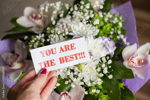 Beautiful greeting card with text You are the best on flowers background for Happy Mother's Day. composition for Mother's Day. Valentines day