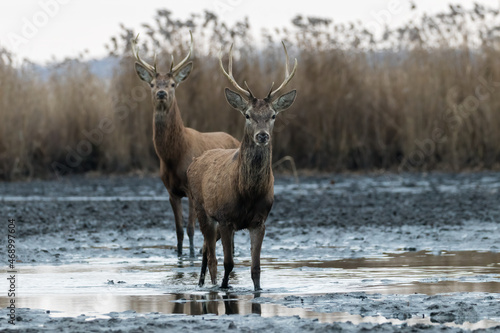 Beautiful male red deer with nice antlers in their natural habitat, Cervus elaphus, large animals in the wild, nature reserve, beautiful bulls and their antlers