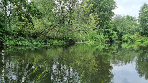 Beautiful natural scenery of river and green forest. Scenic view of a quiet river flowing slowly through the forest. Relaxing scene.