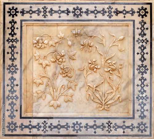 Beautiful ornament on wall of palace in Amber Fort in Jaipur, Rajasthan, India