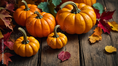 beautiful pumpkins, autumn leaves on a wooden background