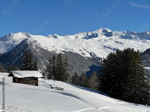 Beautiful sunlit and snow-capped alpine peaks above the Swiss tourist sports-recreational winter resort of Davos - Canton of Grisons, Switzerland (Kanton Graubünden, Schweiz)