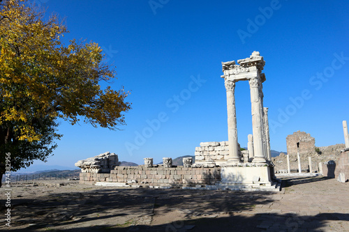 beautiful temple of Trajan with white marble columns on blue sky background, ancient city Pergamon, Turkey
