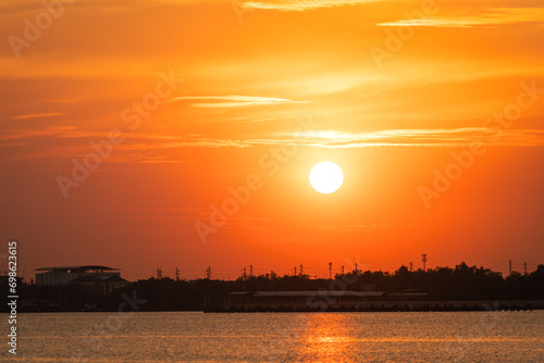 Beautiful view of the orange sunlight during sunset time in the golden hour with river on foreground. Nature view scene.