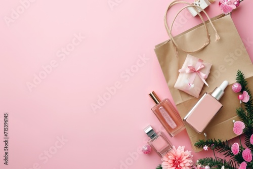 Beautiful woman's makeup, cosmetics, accessories pouring from shopping bags on flat pink background.