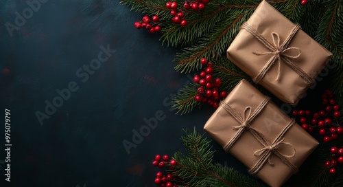 Beautifully wrapped gifts surrounded by evergreen branches and red berries for the holiday season