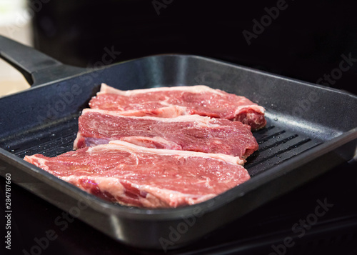 Beef fillet on grill , Beef steaks being prepared on grill , cooking meat steaks on kitchen.
