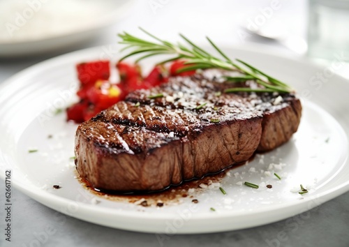 Beef juicy steak fillet on black plate with rosemary and red pepper on white restaurant table.AI Generative