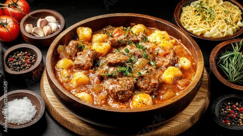 Beef stew traditional classic concept. A hearty bowl of stew with tender meat, potatoes, and herbs, surrounded by spices, garlic, and fresh ingredients on a rustic wooden table.