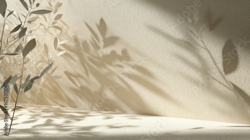 beige, light, cream, shadow, plant, leaf, empty, product, display, minimalist, modern, soft, texture, sunlight, natural, still, life, background, interior, design, elegant, studio, photo, sunlit, shadowy, stage