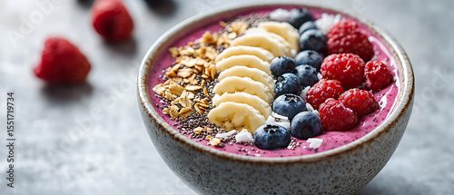 Berry Smoothie Bowl Topped with Banana Slices, Granola, and Fresh Berries