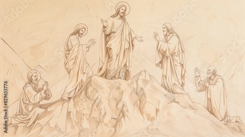 Biblical Illustration: Transfiguration of Jesus, Mountaintop Scene, Moses and Elijah, Disciples in Awe, Beige Background, Copyspace