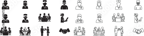 icon, set, vector, people, business, medicals, doctor, nurse, user, avatar, profile, meeting, handshake, teamwork, collection, graphic, illustration, glyphs, solid, outline, line, modern, simple, symbol, pictogram, health, health care, corporate, office, team, agreements, partnership, success, human, support, professional, collaboration, identity, web, app, design, interface