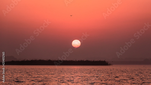 Big Sun rising over water bird flying