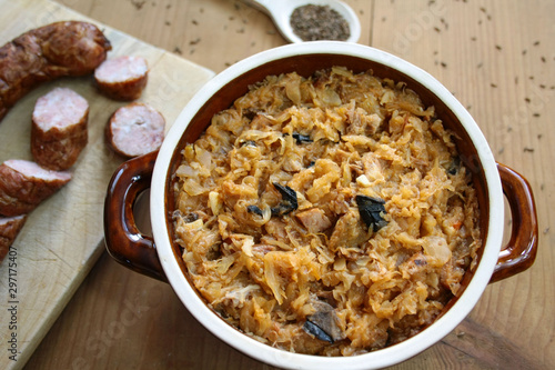 Bigos in stoneware dish and bigos ingredients: sausage, sauerkraut and cumin